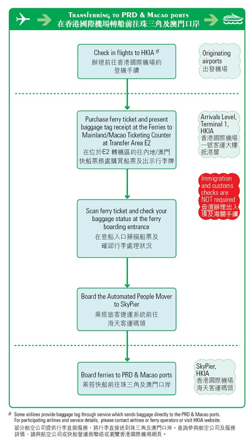 Passengers looking to take a ferry to Macau should proceed to the ferry ticketing counter at Transfer Area E2. DO NOT go through immigration and reclaim your baggage. Passengers who have gone through immigration procedures CANNOT return to the ferry ticketing counter and use the ferry service.